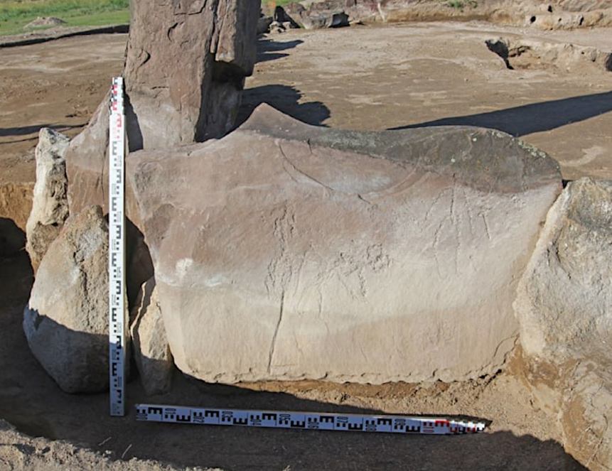 Особый интерес представляет то, что в составе курганных конструкций ученые обнаружили каменные плиты с петроглифами — изображениями, выбитыми на камне. Было изучено десять таких плит.