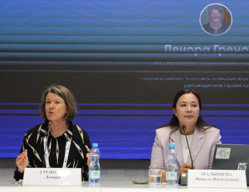Ленора Гренобль и Нинель Малышева на пресс-конференции, посвященной запуску проекта «Языки и культуры народов Севера и Арктики РФ». Источник: пресс- служба СВФУ.